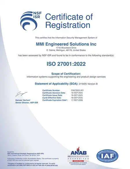 MMI Engineered Solutions is IATF 16949:2016 & ISO 14001:2015 certified with TUV Rheinland of North America.